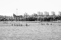 上午10时许,随着发令枪响,4艘蓄势已久的龙舟如离弦之箭般驶出起点,12人标准龙舟200米直道赛预赛正式开始。在鼓手铿锵有力的鼓声指挥下,划手们挥桡划桨,劈波逐浪,船尾的舵手则配合划手保持整艘船直行前进。