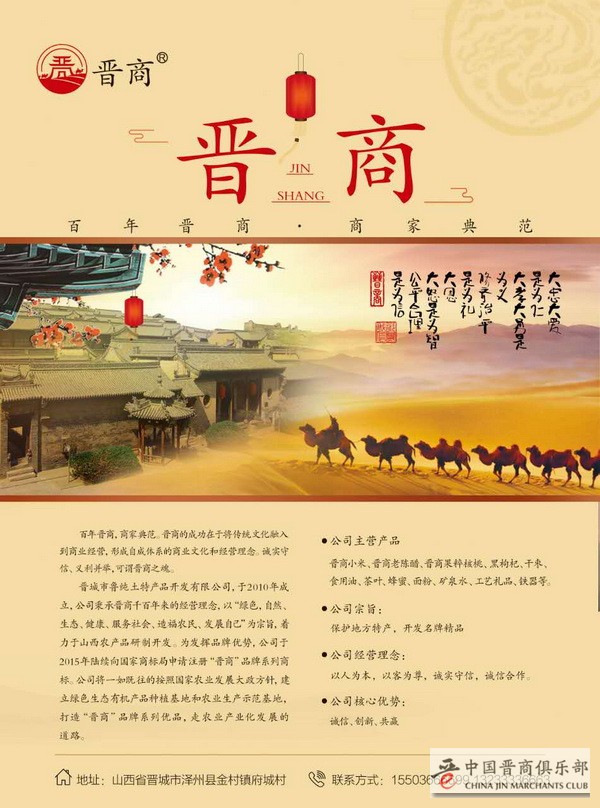 冯贵红董事长表示,鲁纯土特产旗下“晋商”牌系列的小米、陈醋等产品将参加第八届中国晋商年会的“首届晋商优品国际博览”,届时请大家一起共同交流“晋商”牌小米和陈醋的全国市场合作。
