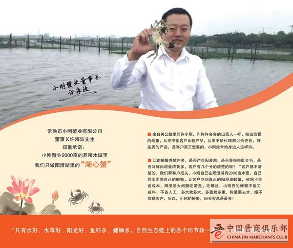 常熟市小刚蟹业公司成立于2004年,其前身可以追溯到上世纪90年代,目前,本公司已经形成集选种,饲养,加工,餐饮为一体的规模型企业。苏州山西商户副会长兼秘书长。常熟市小刚蟹业有限公司董事长许海波先生向各位山西籍好友。老乡以及喜欢吃蟹的各位友人郑重承诺:小刚蟹业只做阳澄湖里的湖心蟹。小刚蟹业友情提醒:吃蟹吃吃湖心蟹。同时,诚邀各界友商一道共同谱写阳澄湖中湖心蟹新的篇章。