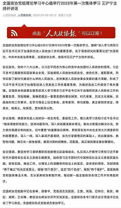 据人民政协报,全国政协党组理论学习中心组3月27日举行2023年第一次集体学习,围绕“深入学习贯彻习近平总书记关于加强和改进人民政协工作的重要思想、关于调查研究的重要论述”交流研讨。中共中央政治局常委、全国政协主席、党组书记王沪宁主持并讲话。
