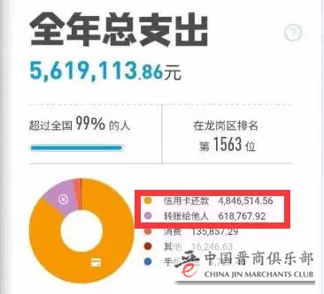 仔细一看,账单最大的流水不过是转账。就拿某土豪的账单为例,560多万的账单中,有546万多都用于转账和还款,真正支出消费只有不到14万。
