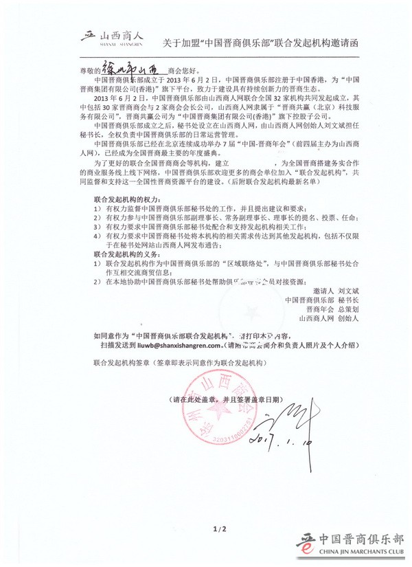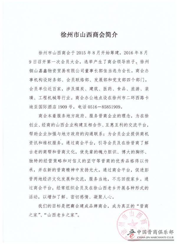 2017年1月10日,中国晋商俱乐部秘书处收到了徐州市山西商会的正式回复,徐州市山西商会正式确认加盟为中国晋商俱乐部联合发起机构。