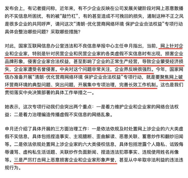 国家互联网信息办公室违法和不良信息举报中心主任申月表示,严厉打击网上恶意损害企业和企业家形象声誉,甚至从中牟取非法利益的违法违规行为。