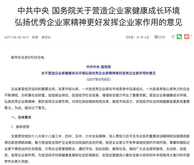 2017年9月,《中共中央 国务院关于营造企业家健康成长环境弘扬优秀企业家精神更好发挥企业家作用的意见》,意见开宗明义:“企业家是经济活动的重要主体。改革开放以来,一大批优秀企业家在市场竞争中迅速成长,一大批具有核心竞争力的企业不断涌现,为积累社会财富、创造就业岗位、促进经济社会发展、增强综合国力作出了重要贡献。营造企业家健康成长环境,弘扬优秀企业家精神,更好发挥企业家作用,对深化供给侧结构性改革、激发市场活力、实现经济社会持续健康发展具有重要意义。”