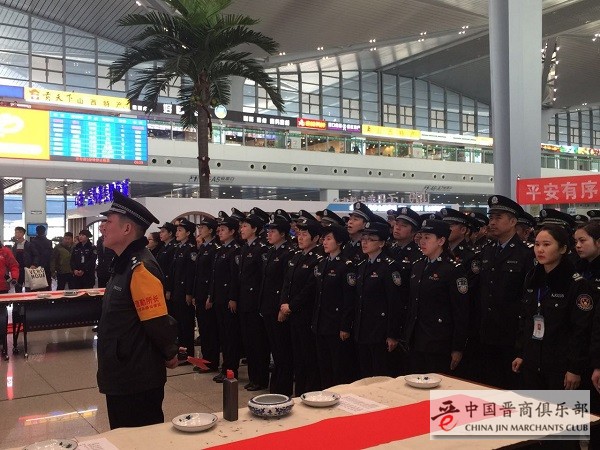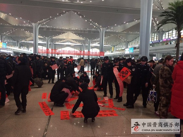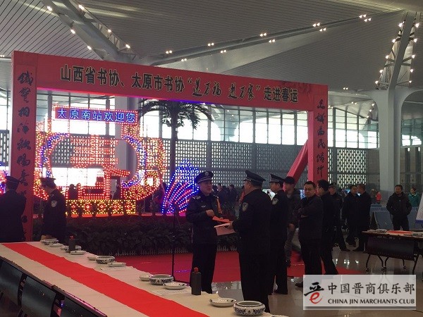 为了深入贯彻落实学习习近平总书记在文艺座谈会上的讲话精神,弘扬中国精神,凝聚中国力量,确保2017春运旅客出行安全、有序、温馨,1月13日春运首日,山西省、太原市书协与太原铁警在太原南火车站举办了春运首日启动仪式,30余名书法家现场创作,200名铁路民警安全温馨宣传,警民联合开展了一场别开生面的“送万福、进万家“春运一线公益服务活动。