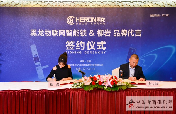 2017年1月18日,柳岩与‘黑龙HERON’指纹锁品牌形象代言签约仪式在北京如期举行,广东黑龙智能科技有限公司(2015十大优秀新晋商人物)董事长宋庆华先生出席了该签约仪式。在一片喜悦的气氛中,董事长宋庆华正式宣布聘请柳岩小姐担任‘黑龙HERON’指纹锁品牌形象代言人,并现场签写了代言聘书,同时,柳岩小姐也亲自为宋庆华先生颁发了授权书,这标志着双方的合作之旅正式开启。此次合作,对双方都具有重要意义!