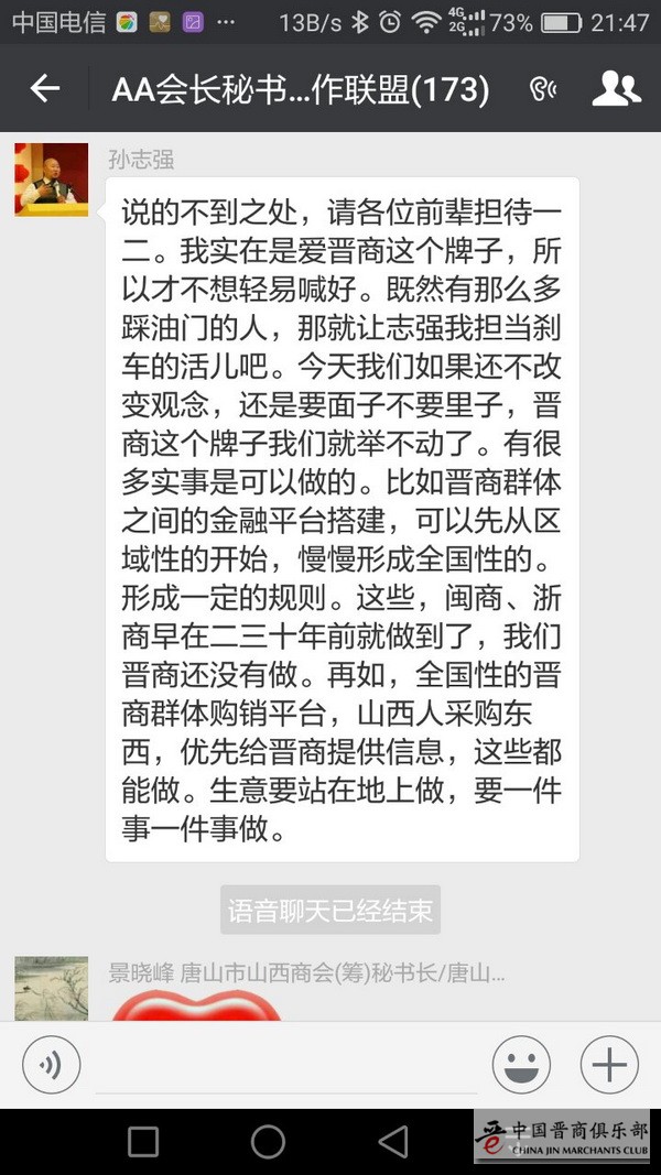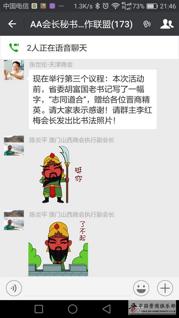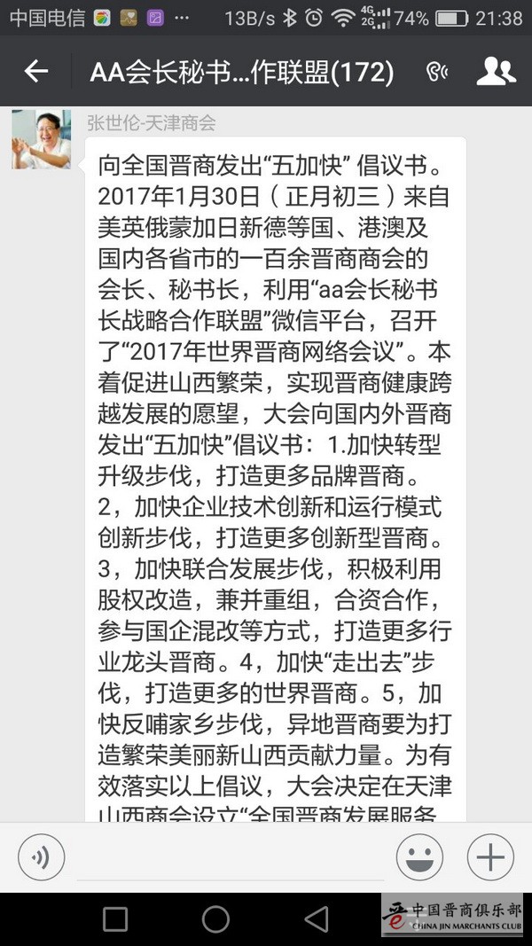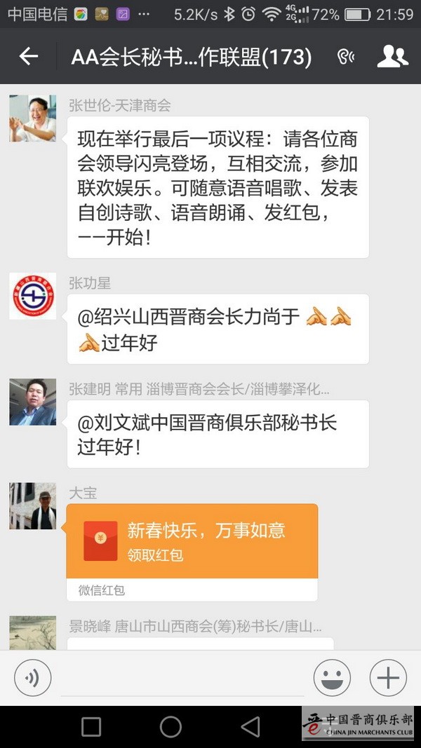 2017年1月30日(正月初三)来自美英俄蒙加日新德等国、港澳及国内各省市的一百余晋商商会的会长、秘书长,利用“aa会长秘书长战略合作联盟”微信平台,召开了“2017年世界晋商网络会议”。