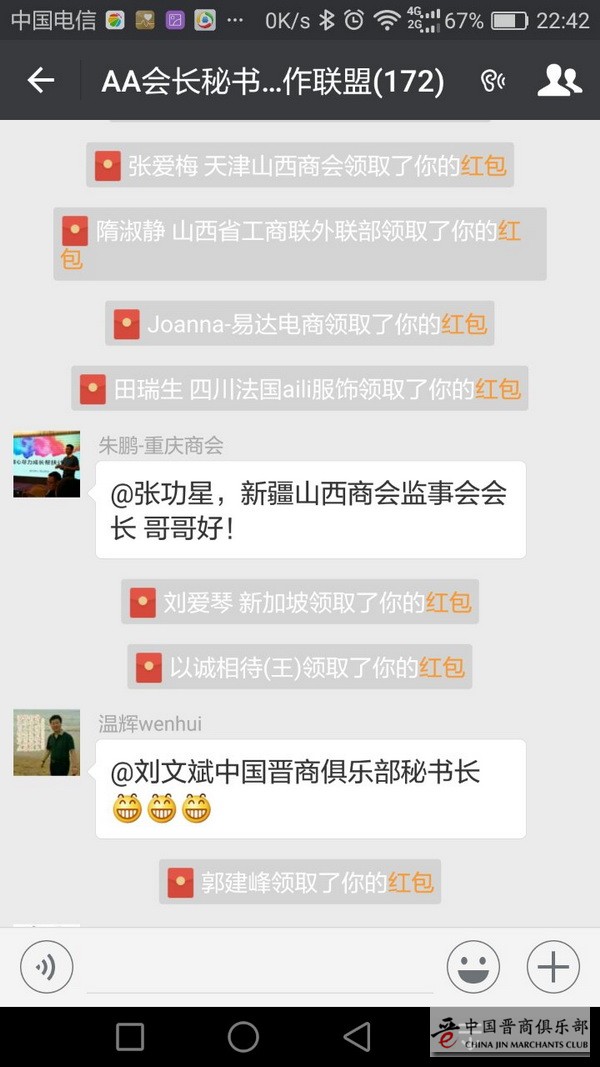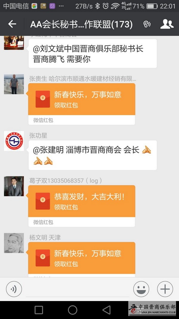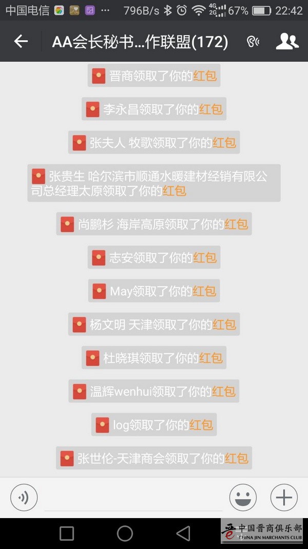 大会最后一项议程是红包祝福,在张世伦会长的一声令下,群里刮起了红包雨,活动圆满结束。