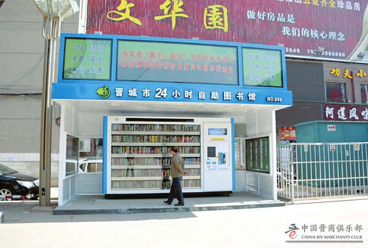 “街区24小时自助图书馆系统”是晋城市“倡导全民阅读,建设书香社会”的重要举措,是该市建设文化强市的重点工程之一,是文化惠民的重大实事。该项目拟在市区范围内投放40台24小时自助图书馆,首批8台安装在凤台街等沿线,并于10月15日晋城建市30周年庆典当天正式开放,市民读者可以24小时全天候在这些自助机上完成借还书程序。后期30台也在紧张的选址中,预计明年5月1日建设完毕,全部投入使用。届时晋城市民将可实现在家门口就近借阅。