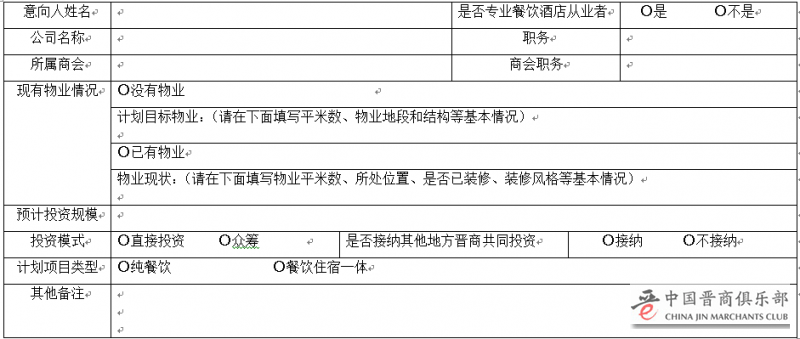 “山西会馆”项目合作意向登记表格式如下(请联系中国晋商俱乐部秘书处15300248390索取具体电子版文件):