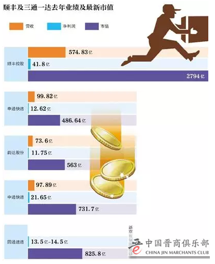 从中可以看出,顺丰归属净利润总额是申通的3.3倍,是韵达的3.55倍,但从净利润率指标看,顺丰只有7.2%,而韵达是15.96%,申通是12.64%,中通是22.1%。而从市值看,顺丰市值已超三通一达之和。