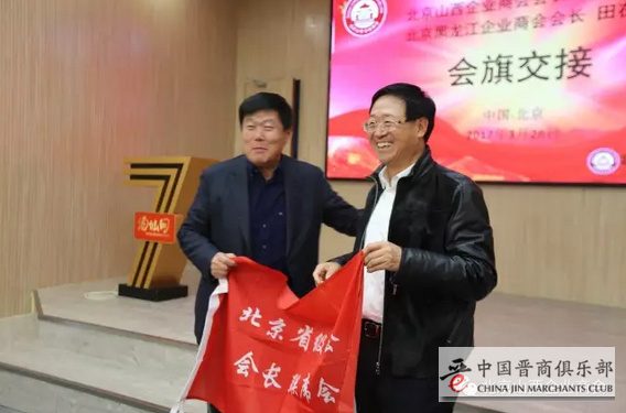 会旗交接环节,北京山西企业商会会长李建国把联席会会旗交接给北京黑龙江企业商会会长田在玮会长。