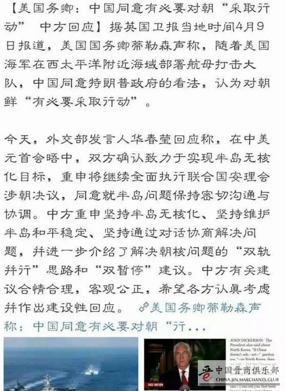 中国官方一直坚持,朝鲜核问题是朝美的矛盾。即便是美国政要,主要是美国国务卿蒂勒森,这几天在西方媒体的配合下全世界散布,中国同意特朗普政府的看法,认为对朝鲜“有必要采取行动”,暗示中国已经同意美国对朝鲜动武。4月10日,在回答“美国国务卿蒂勒森周日接受美国电视时政节目采访时称,在中美元首会晤时,中方认同半岛形势的严峻性和威胁程度已经达到新的高度,支持美国让朝鲜政府改变想法的做法。中方对此有何评论”时候,中国外交部发言人华春莹的回答是“在中美元首会晤中,双方确认致力于实现半岛无核化目标,重申将继续全面执行联合国安理会涉朝决议,同意就半岛问题保持密切沟通与协调。中方重申坚持半岛无核化、坚持维护半岛和平稳定、坚持通过对话协商解决问题,并进一步介绍了解决朝核问题的“双轨并行”思路和“双暂停”建议。中方有关建议合情合理,客观公正,希望各方认真考虑并作出建设性回应”。这段话的关键词是“对话协商解决”、“半岛和平稳定”、“半岛无核化”、“双轨并行”和“双暂停”。从哪里能看出,中国同意美国对朝鲜动武了?倒是外交部很明确的再次坚持了中国一贯的“双轨并行思路”和“双暂停”建议。这个建议就是建立在朝鲜核问题是朝美矛盾的基础上,说明中国政府对朝鲜核问题的立场并没有发生根本变化。