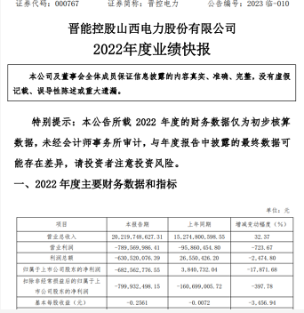 4月11日,晋控电力(000767)发布2022年度业绩快报,公告显示,2022年度营业总收入为20,219,748,627.31元,比上年同期增长32.37%;归属于上市公司股东的净利润为-682,562,776.55元,较上年同期由盈转亏。