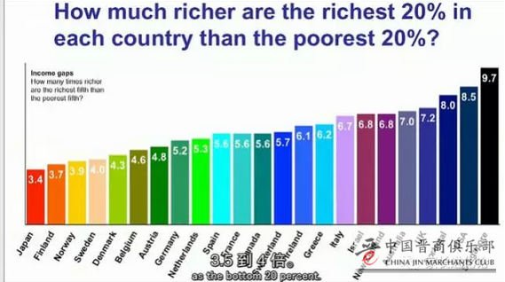 在他的研究中,国家之间的平等程度,通过“最富的20%比最穷的20%富多少”来排序的(下图)。