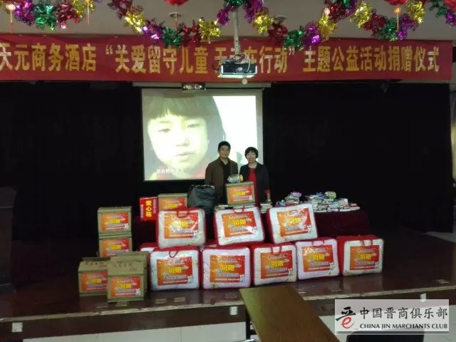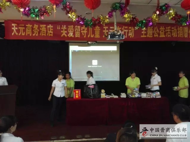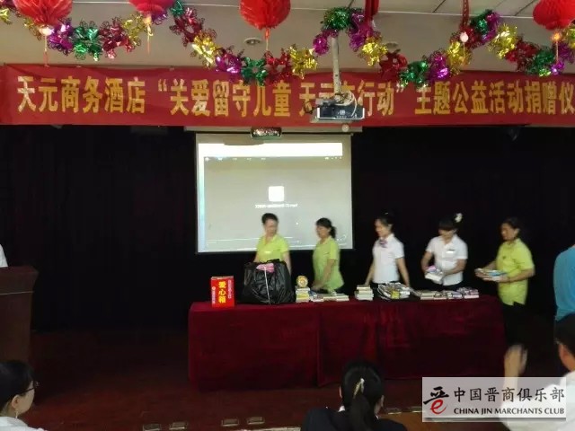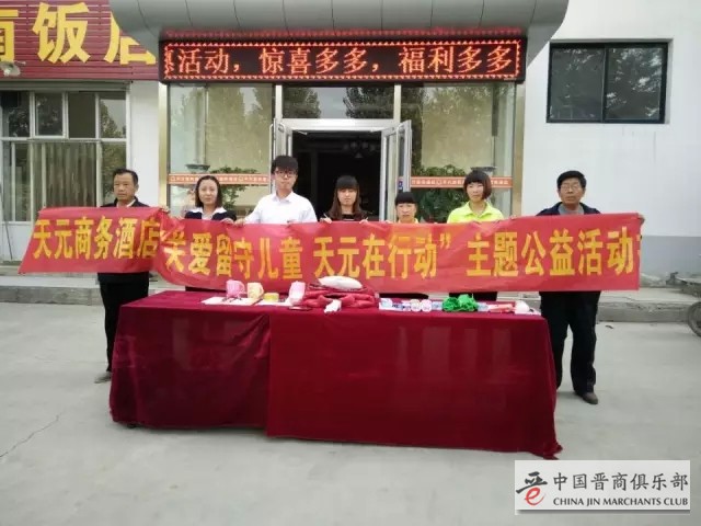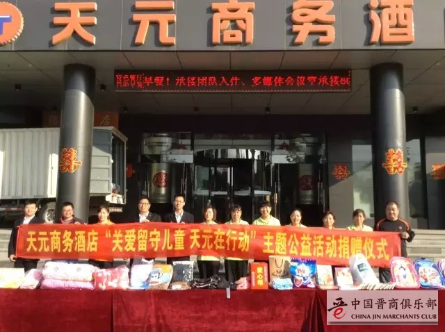 天元商务酒店为响应天元集团发起的“关爱留守儿童、天元在行动”大型公益活动的号召,分别在15.16日两天在三家酒店组织员工向赞皇“阳光小学”贫困留守儿童奉献爱心的捐赠活动。