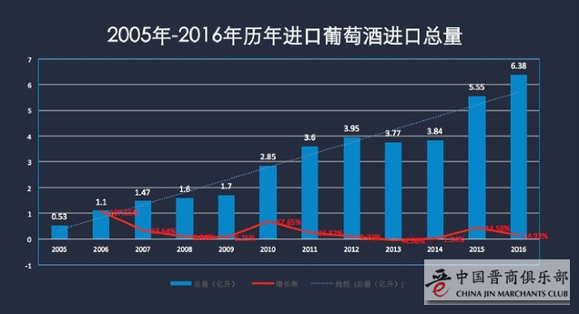 有数据显示,从2005年~2016年,进口葡萄酒进口总量除了2013年、2014年略有下降之外,其他年份都呈现出增长之势,每年以20%的速度增长。