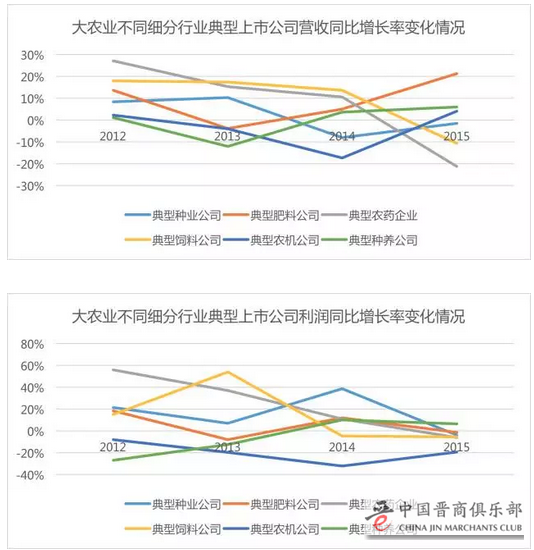 从典型种业来看,2014年以来普遍营收增长乏力,2015年利润也开始走向下坡;从典型肥料公司来看,营收能保持一定增长,但利润增长堪忧;从典型农药公司来看,营收与利润的增长幅度均逐年下滑,在2015年出现行业营收整体萎缩以及利润负增长;从典型饲料公司来看,2015年是营收的一个相对谷底,利润下滑,只待周期再起;从典型农机公司来看,2015营收略有增长,但利润流失缺难以挽回;从典型种养公司来看,营收和利润均保持小幅增长。