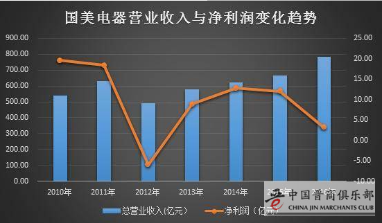 另外值得注意的是,集团公告显示,2016年3月国美电器收购了黄光裕旗下艺伟发展有限公司及其附属公司,其财务已经并入国美报表。如果去掉艺伟发展并表带来的利润,国美去年的利润将会更低(艺伟发展2016年并表后带来1.35亿利润)。下图是国美营业收入与净利润变化趋势: