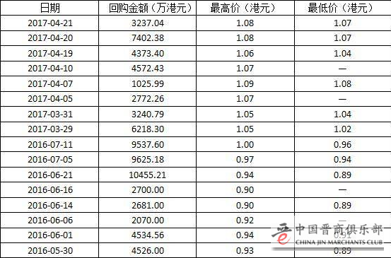就在4月25日发布年报的前一周,国美连续三天回购股票。4月19日至21日,国美三天累计回购1.41亿股集团股票,总耗资约1.5亿港元。今年三月初至今,国美累计回购约3.1亿股,总计动用资金3.28亿港元。如果在算上2016年回购的股票,国美累计回购8.04亿股股票,总耗资7.9亿港元。下面是国美回购的明细表: