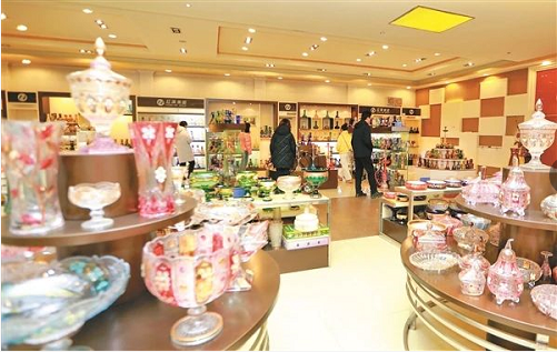 祁县红海玻璃文化艺术园内,晶莹剔透、色彩艳丽的玻璃器皿吸引游客驻足观赏选购。记者 耿新洲 摄