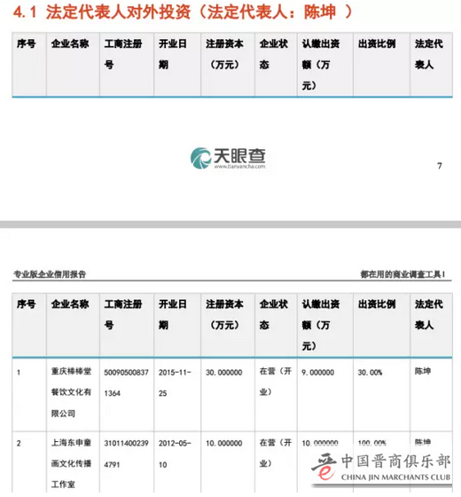 除了前述东申童画外,还包括重庆棒棒堂餐饮文化有限公司(出资9万,持股30%)、北京天天美尚信息科技股份有限公司(持股148.80万,占比3.18%)、和和(上海)影业有限公司(出资198万,占比4.62%)、霍尔果斯智游乾坤网络科技有限公司(出资100万,持股100%)、无锡陈坤影视文化工作室(出资500万,持股100%)、东申(上海)影业有限公司(出资990万元,持股99%)、北京阿米文化发展有限公司(出资60万,持股40%),以及东申空间(北京)艺术设计有限公司(出资27万,持股90%)。