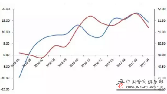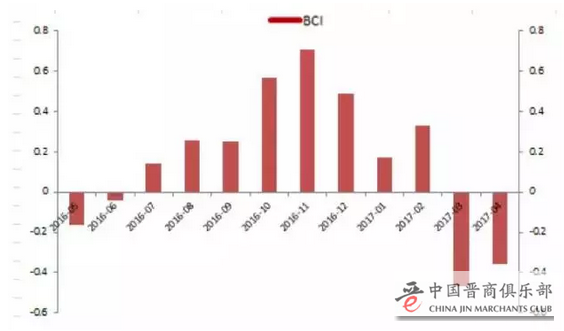 郭磊比较关注的另一个指标──生意社BCI,在2016年7月至2017年2月处于扩张期,2017年3月为-0.47,2017年4月为-0.36,整体指向是已经度过景气区间。