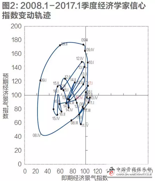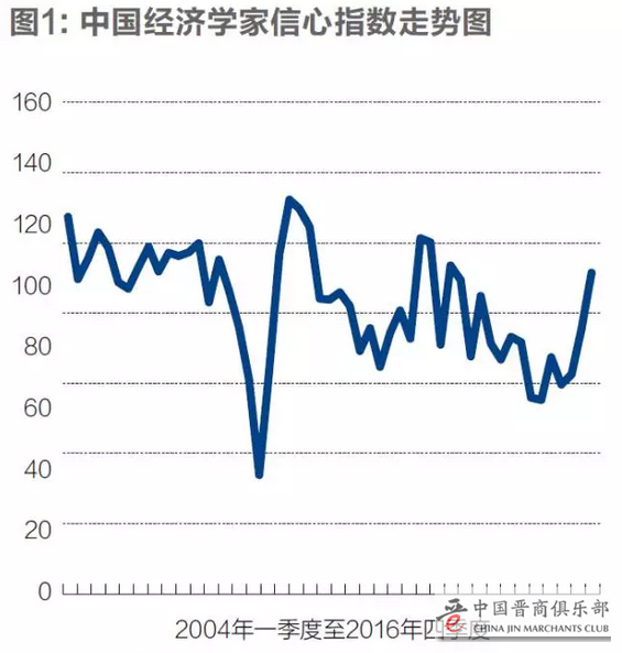 国家统计局中国经济景气监测中心于2017年3月进行的中国百名经济学家信心调查显示,2017年一季度经济学家信心指数为108.5(取值范围在0-200之间),比上季度提升20.2点,为三年来的最高点(见图1)。