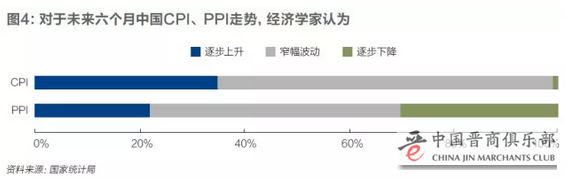 预期工业品价格指数趋于顶部。对于未来六个月我国工业品出厂价格指数(PPI)走势,调查结果显示,22%的经济学家预期“逐步上升”,比上季度减少33个百分点;48%预期“窄幅波动”,增加9个百分点;30%预期“逐步下降”,增加24个百分点(见图4)。