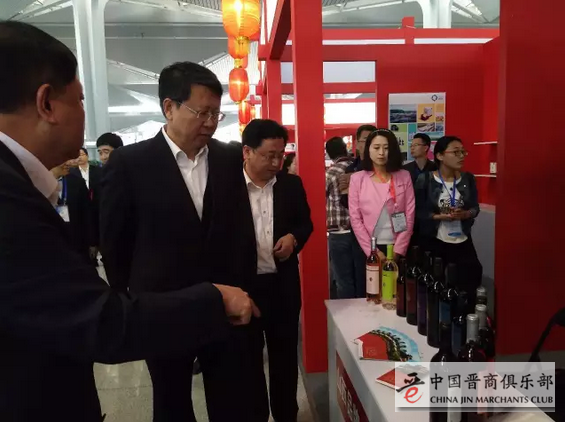 山西省商务厅厅长孙跃进向省政协副主席张璞、太原铁路局局长赵春雷介绍戎子酒庄。