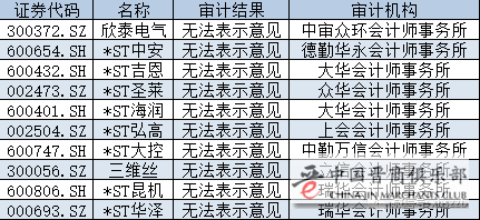 与以往相比,2016年年报季一大特点是被出具“无法表示意见”的公司数目大幅上升,达到了10家,包括*ST昆机、欣泰电气、*ST大控、*ST圣莱、*ST华泽、*ST弘高、*ST海润、*ST中安、*ST吉恩,和三维丝,被出具“无法表示意见”。一般来说,“无法表示意见”几乎可直接宣告年报质量“不合格”。而在这10家公司中,不乏一些公众熟知的问题公司,财务混乱是其被出具“无法表示意见”的主要原因。
