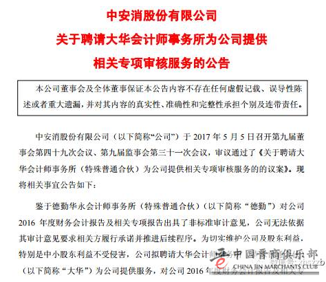 *ST中安后续应对也颇有看点。5月6日公司直接发布拟更换审计机构,公司表示,为切实维护公司及股东利益,公司拟聘请大华会计师事务所为公司提供服务,对2016年度财务会计报告及相关专项报告进行专项审计或复核。