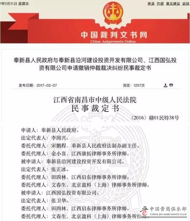 7月5日,南昌仲裁委员会作出(2016)洪仲裁字第47号裁决书,裁决奉新县政府应向申请人支付潦河两岸延伸工程建设、土地征用、报批、拆迁、开发建设等费用和投资收益31827.16万元及相应的利息。