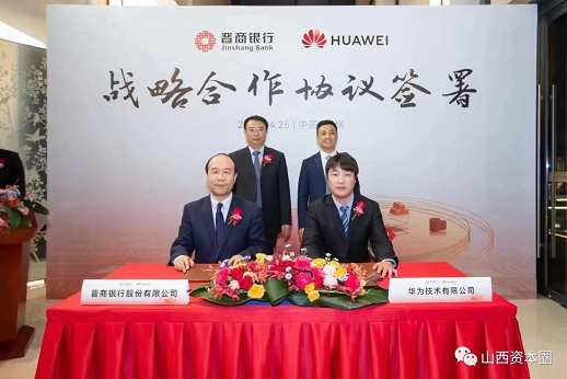 4月25日晋商银行与华为技术有限公司在深圳正式签署战略合作协议。晋商银行行长张云飞、华为数字金融军团CEO曹冲、华为山西代表处总经理鲍歌堂见证签约,晋商银行副行长王义斌、华为山西代表处副总经理刘嵬代表双方签约。