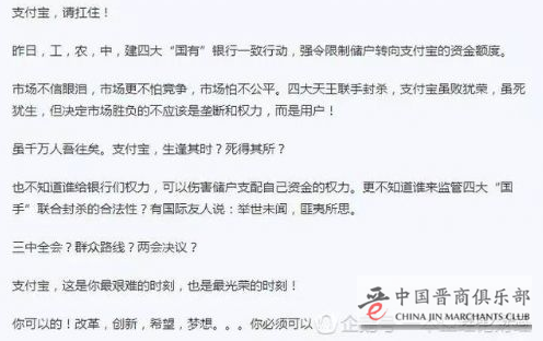 而现在的支付宝已经不再是一个单一的支付工具,在去年支付宝的蚂蚁借呗就抢走了银行8000亿的市场份额,这么大的市场被马云一人独吞,银行自然是眼红。