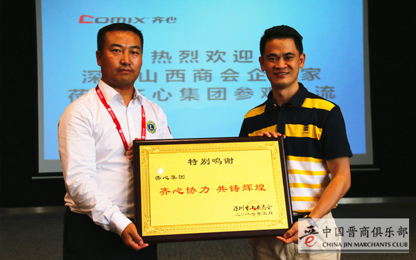 随后,香港山西同乡会副会长、香港华商创业联合会创会会长兼深圳市山西商会代理会长景苗军发言,对齐心集团及陈钦武董事的盛情接待表示诚挚的谢意,也希望由此产生更多合作的机会,并代表商会向齐心集团赠送刻有“齐心协力,共铸辉煌”的牌匾和富有象征意义的关公铜像。
