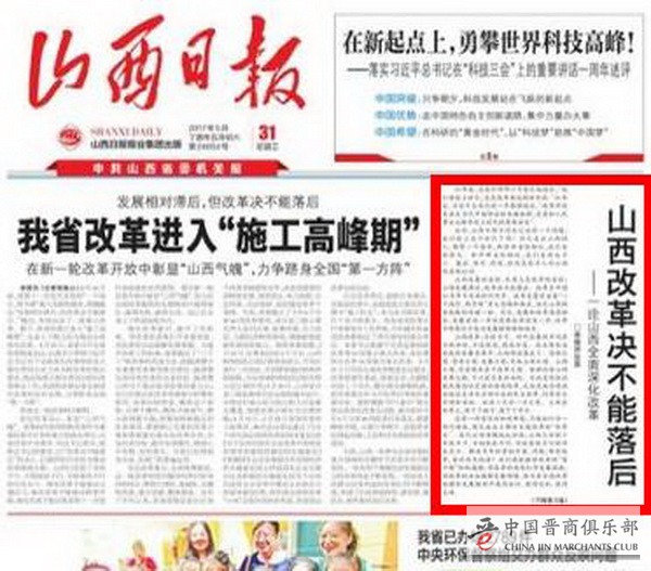 山西改革,迫在眉睫。目前山西,正在努力实现振兴崛起。振兴动力源自改革。省委将改革放在山西全局工作的核心地位,要在新一轮改革开放中彰显“山西气魄”,让山西更多的改革进入全国第一方阵。省第十一次党代会拉开了山西全面深化改革向纵深推进的大幕。我们必须直面矛盾和问题,以振臂一呼、舍我其谁的勇气,坚定不移地推进各项改革,以“咬定青山不放松”的定力和久久为功、驰而不息的韧劲,真改深改狠改。改革有风险、改革有难度、改革有成本……种种借口之下,只能是碌碌无为无所作为。回首改革开放30多年走过的路,唯有改革才能突破重围,才能涅槃重生。山西今后几十年的发展,取决于今天的选择;我们这一代人的作为,决定着山西的未来。