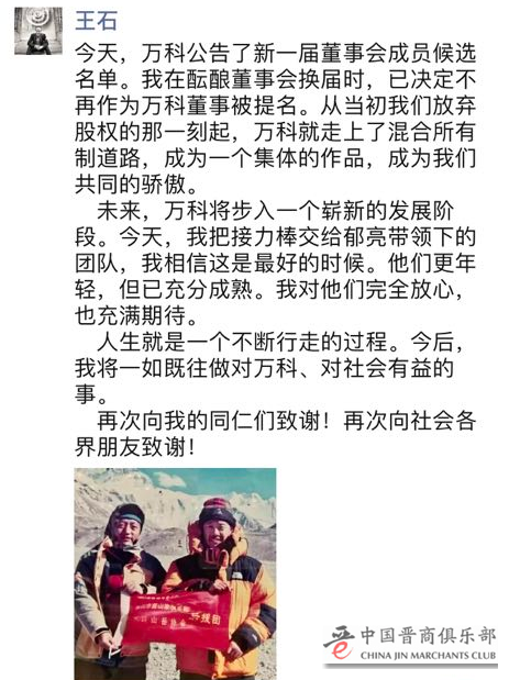 而王石选择了在此时主动让贤。他通过微信朋友圈表示:“今天,万科公告了新一届董事会成员候选名单。我在酝酿董事会换届时,已决定不再作为万科董事被提名。从当初我们放弃股权的那一刻起,万科就走上了混合所有制道路,成为一个集体的作品,成为我们共同的骄傲。未来,万科将步入一个崭新的发展阶段。今天,我把接力棒交给郁亮带领下的团队,我相信这是最好的时候。他们更年轻,但已充分成熟。我对他们完全放心,也充满期待。”