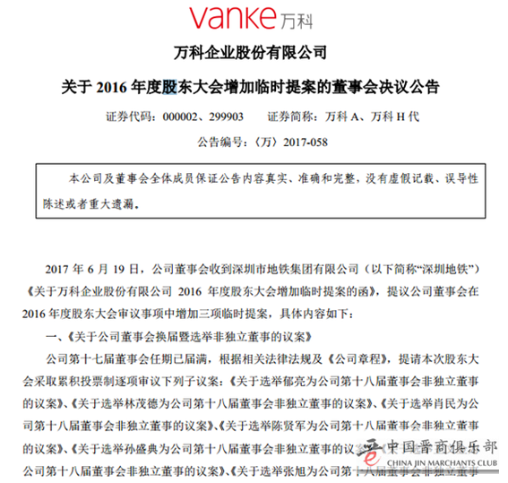 万科公告称,公司于6月19日收到深圳地铁关于万科2016年度股东大会增加临时提案的函,提议增加董事会换届临时提案,拟提名郁亮、林茂德、肖民、陈贤军、孙盛典、王文金、张旭为第十八届董事会非独立董事候选人,提名康典、刘姝威、吴嘉宁、李强为第十八届董事会独立董事候选人,提名解冻、郑英为万科第九届监事会非职工代表监事候选人。经万科董事会6月20日审议,同意该临时提案提交2016年度股东大会决议。