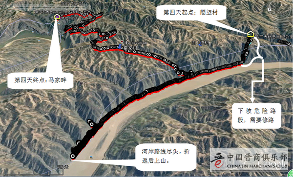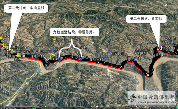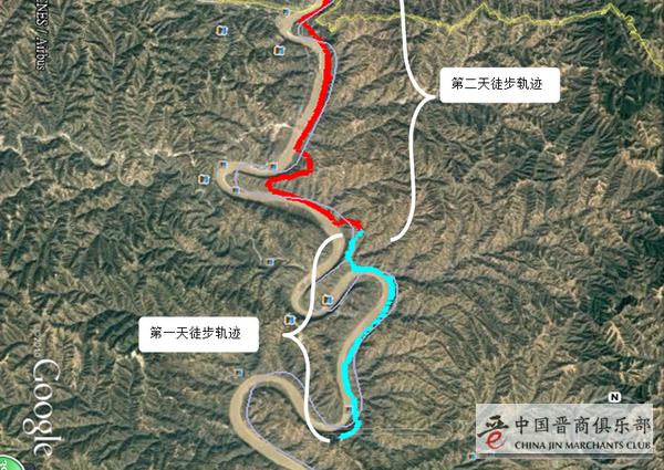 早晨6点30分,从黄家岭出发,下山后沿黄河东岸行走,在徒步里程7.7公里处(9点31分)横切半岛抄近路上山,徒步里程9.5公里处经过郭家山村再次下山(10点37分)沿河岸前行,下午15点38分徒步里程15公里处到达河岸尽头的一个山谷(坐标36° 48' 28.7" 110° 25' 09.5"),在仔细寻找后发现崖壁上的小路,但因为过于险峻,除了向导之外,其他人坐渡船过河,从陕西一侧的公路绕道永和关,下午16点整,向导开始沿这段崖壁路线继续前行记录轨迹,这段路线紧贴崖壁,大约有2公里长,有些地方最窄处仅有脚掌宽,暴露感很强,滑坠的风险比较大,路面需要重新修筑,这段路的详细轨迹参数请见—附表1。崖壁路线尽头是一个人工沙场(坐标36° 49' 23.2" 110° 24' 55.7"),之后就是沿黄公路。下午19点整,徒步里程27公里处(坐标36° 51' 15.1" 110° 25' 13.9")上山,下午19点45分,徒步里程29公里处到达第二天的休息点,中山里村(坐标36° 51' 35.6" 110° 25' 29.7" )