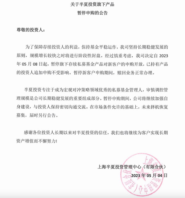5月4日,半夏投资在其官方网站发布《关于半夏投资旗下产品暂停申购的公告》称,为保障存续投资人的利益,保持基金平稳运作,该公司坚持长期稳健发展的原则,规模增长较快之时将进行阶段性封盘。