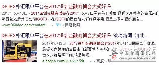 根据网络资料显示,深圳是IGOFX在中国的诈骗起源地,现在在网络上搜索,还能找到IGOFX在2017深圳金融商博会大受好评的信息。