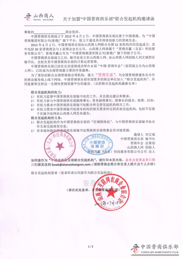 2017年7月19日,中国晋商俱乐部秘书处收到了山西省互联网农商企业联合会的正式回执。