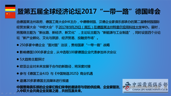 "第五届全球经济发展论坛 2017“一带一路”德国分会"为德国晋商俱乐部成立以来第一次举办中德企业家之间的经济交流对接活动。