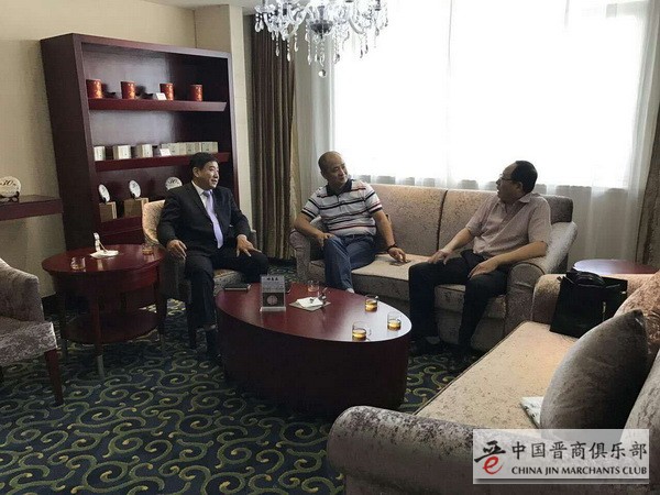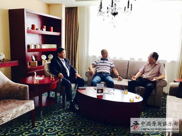 图为中国晋商俱乐部秘书长刘文斌(中)与大昌国际酒店副总经理陈勇(左)、昆明市晋商商会会长常胜利交流