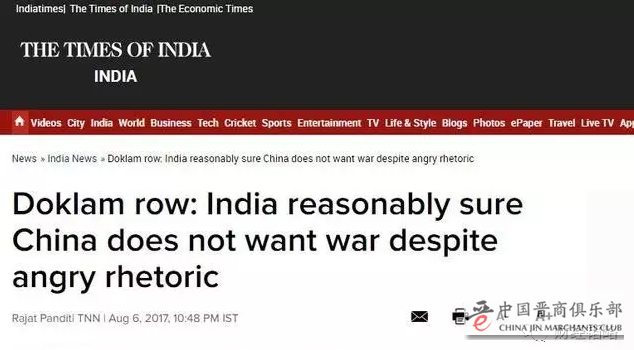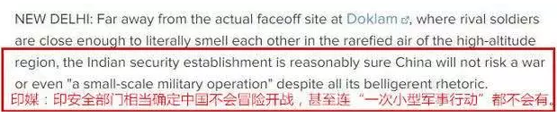 但一些印度媒体似乎仍未放弃为非法越界的印度士兵“摇旗呐喊”,甚至出言挑衅。《印度时报》网站在其8月7日的头条新闻中宣称“尽管言辞愤怒,但印度‘相当确定’中国不想开战”。还说:印度安全部门相当确定中国不会发动战争,甚至连“一次小型的军事行动”都不会有(见下图)。