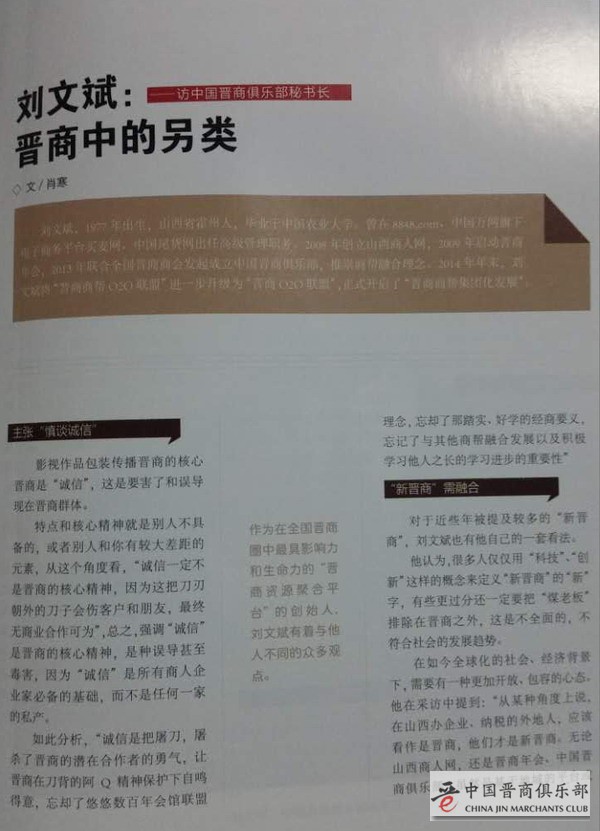 据悉,《中国商会》曾经刊登过中国晋商俱乐部刘文斌秘书长的专访报道,报道题目为“晋商中的另类”,阐述了刘文斌秘书长关于晋商相关的核心观点。