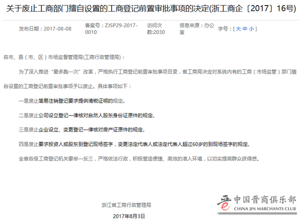 今天又看到了浙江省“关于废止工商部门擅自设置的工商登记前置审批事项的决定(浙工商企〔2017〕16号)”,如下图:
