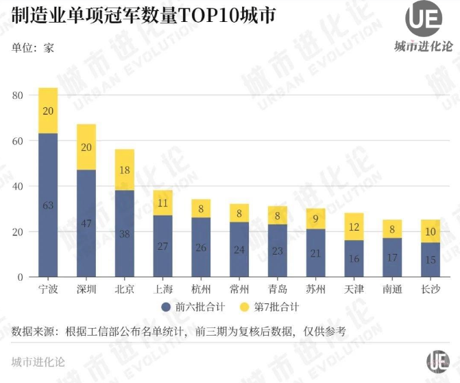 比如,从工信部发布的前七批制造业单项冠军企业(产品)的省份分布来看,上海拥有的企业(产品)数量仅位于全国第9,湖南、河南等中部省份已然居上。再看城市分布,上海以38家居于第4,远低于排名第一的宁波(83家),拥有25家、位居第10的长沙亦距其不远。