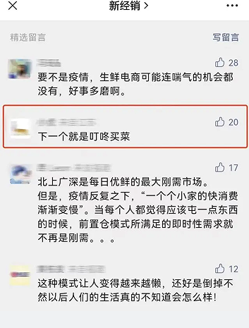 在每日优鲜事发当日,新经销发布的《每日优鲜突然宣布团队解散,前置仓模式还有出路吗?》评论区有一位来自江苏的用户留言:
